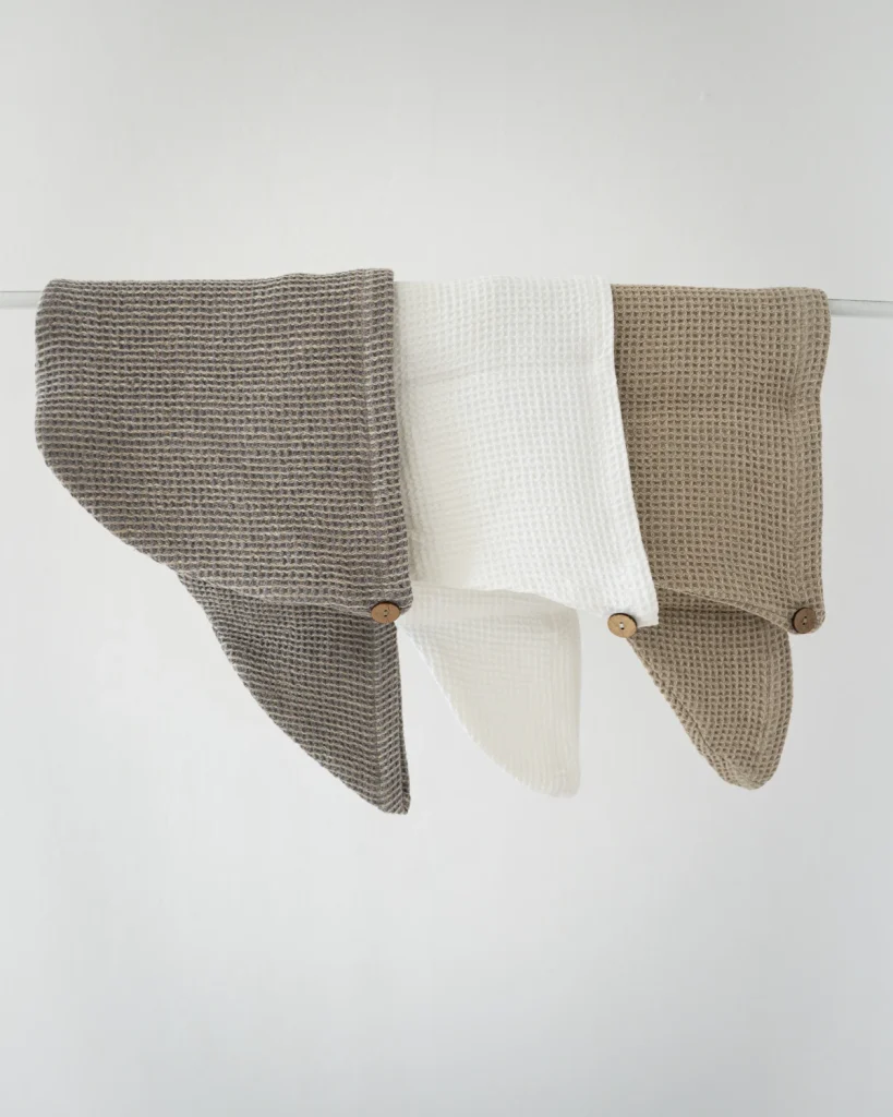 Turban do włosów wykonany jest z miękkiej, lnianej tkaniny o strukturze wafla, która świetnie chłonie wodę, ale nie niszczy struktury włosa. Turban chroni włosy przed wysoką temperaturą w saunie, zapobiegając ich przesuszeniu. Naturalne właściwości lnu sprawiają, że turban jest przewiewny i hipoalergiczny, co czyni go idealnym wyborem dla osób o wrażliwej skórze głowy. Jego ergonomiczny kształt zapewnia wygodne dopasowanie, nie powodując ucisku.